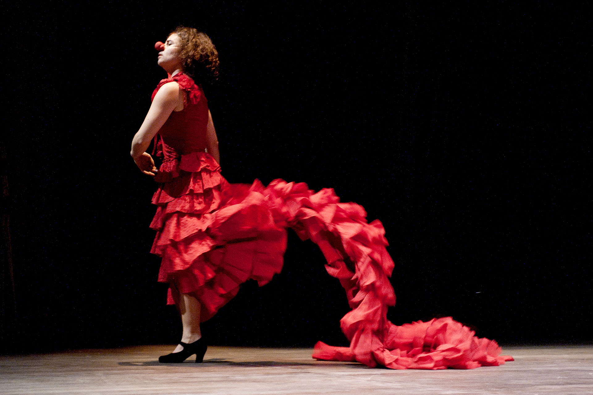 Rosa è una donna, un clown, è un po’ tutto. È tutto quello che sono le donne e di più, perché in fondo chi la obbliga a stare dentro una scatola di vincoli? Rosa può indossare tutti gli abiti che vuole e essere chiunque, infine può anche far fuoriuscire la sua femminilità attraverso canzoni e mosse di Flamenco. Il corpo di Rosa riempie completamente lo spazio, i pochi oggetti in scena perdono il loro senso e il loro utilizzo viene alterato per adattarsi a quello che vuole il clown, come l’enorme attaccapanni a cui sono appese le idee di una donna.